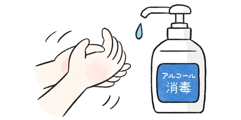 消毒剤を手のひらに取り、「手のひら→手の甲→指先・爪の間→指の間→親指→手首」の順で手全体によくすり込んで、自然に乾かします。