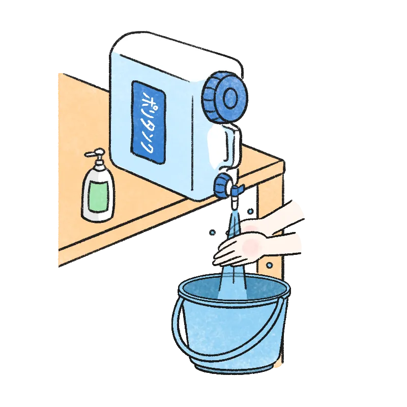 水が少しでも使える場合はタンクやペットボトルで手洗い場を設置することも可能です。