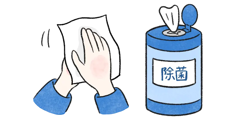 ウェットティッシュやおしぼりなどで手指の汚れをよく落とします。