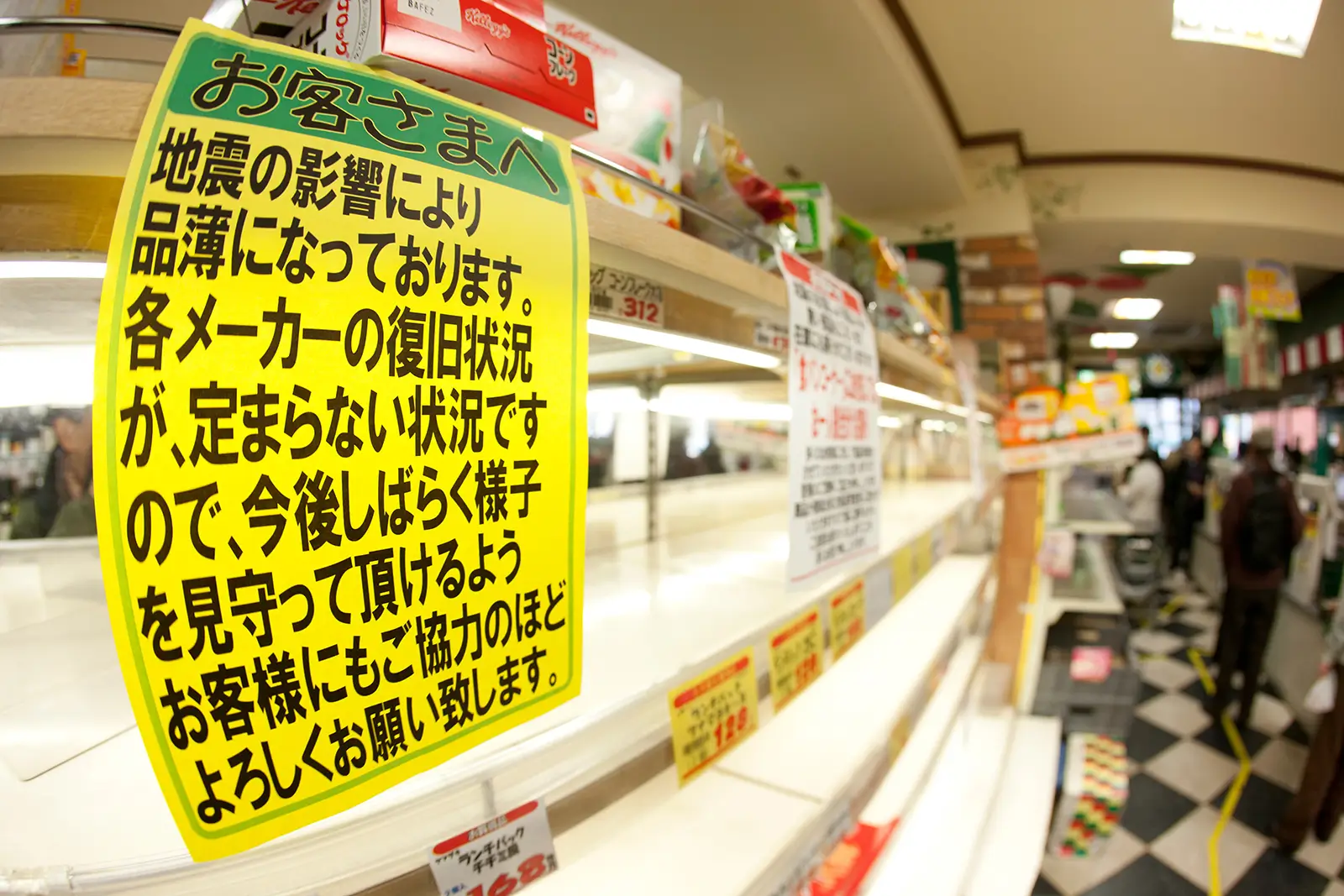 災害が起こると各地のコンビニやスーパーで品薄が発生しやすくなります。震災により物流がストップしてしまい運べない、工場が被災し生産できない、消費者による「買い占め」が起こったことなど、水や食料品、日用品がなくなりやすくなります。災害直後に焦って必要以上に買いだめをしないよう、日ごろから多めに購入してストックしておくなど、準備をしておくことが大切です。