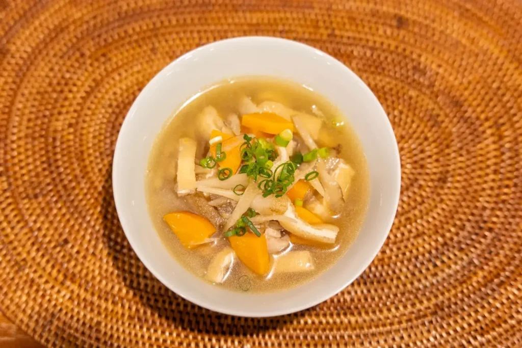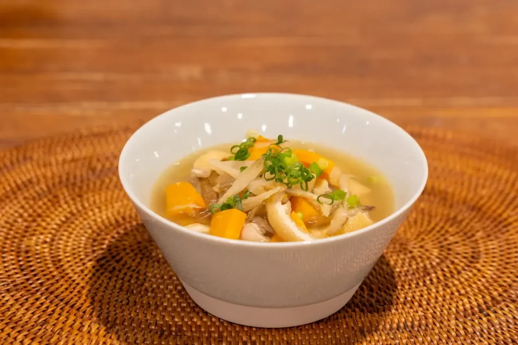 枚方を代表する郷土料理のひとつ。ごぼう(ごんぼ)と卯の花(おから)を使った、あっさり味のすまし汁です。