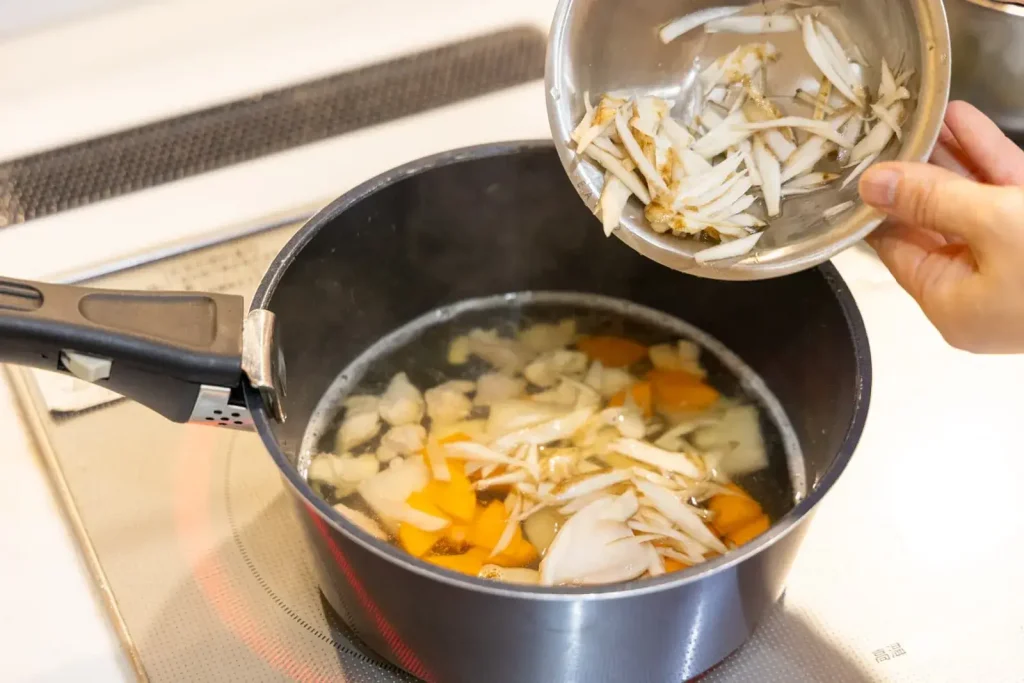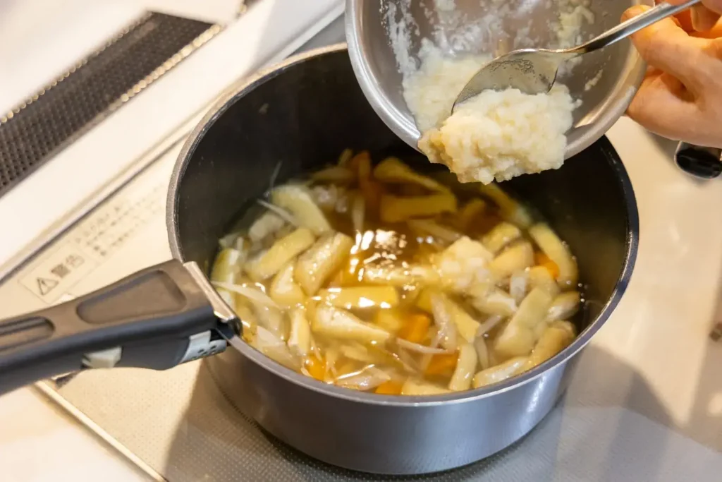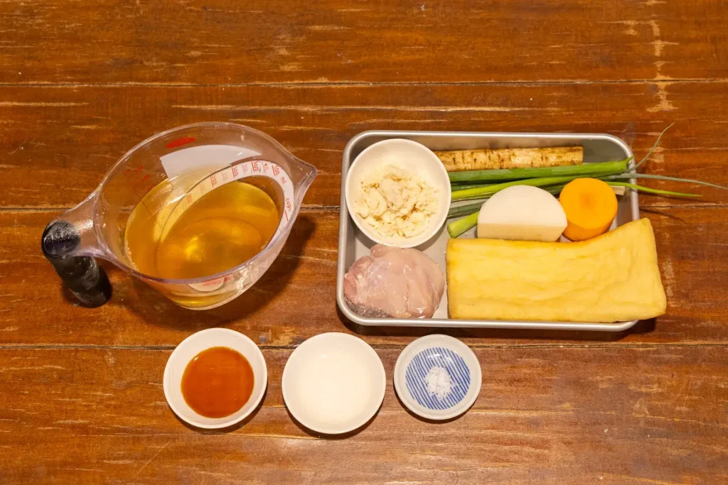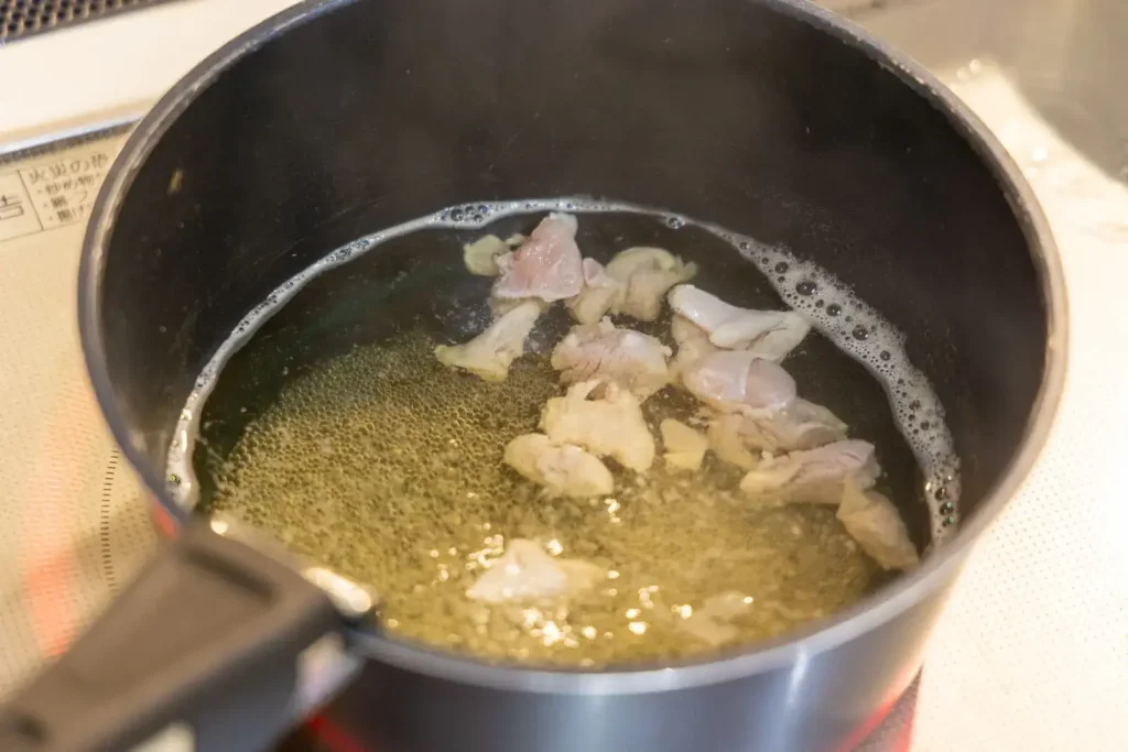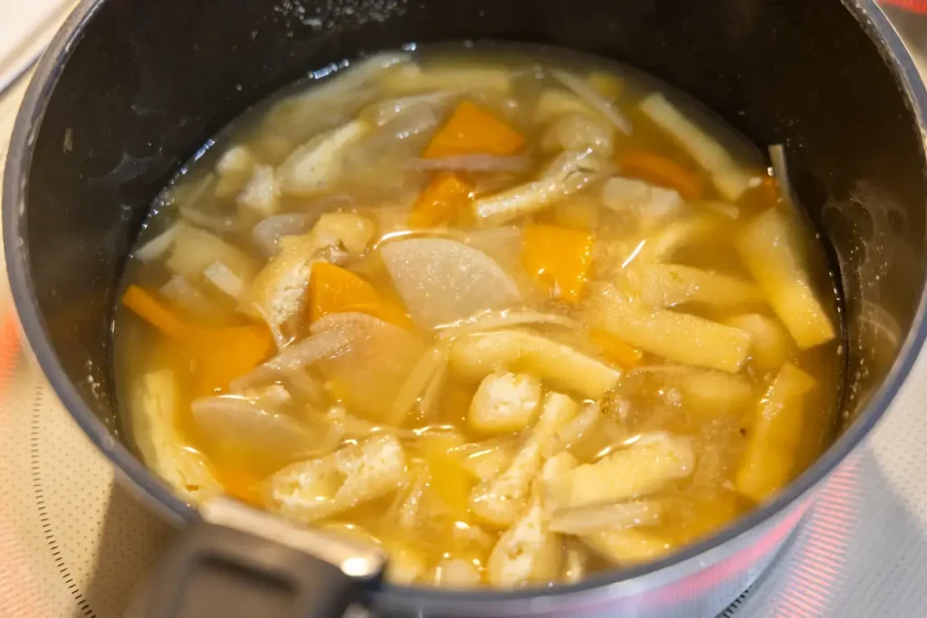 鍋にだし汁を入れて火にかけ、沸騰したら鶏肉を入れます。アクを丁寧に取りながら、ごぼう、にんじん、大根、うす揚げを順番に加えて煮ていきます。