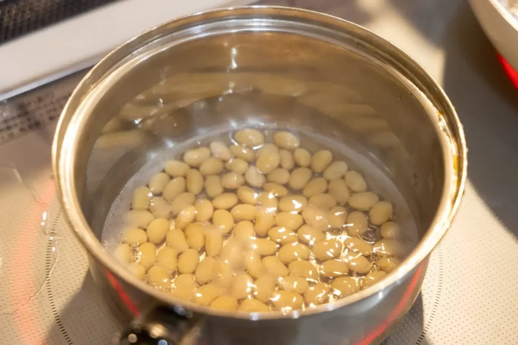 ①大豆を鍋に入れ、火にかける