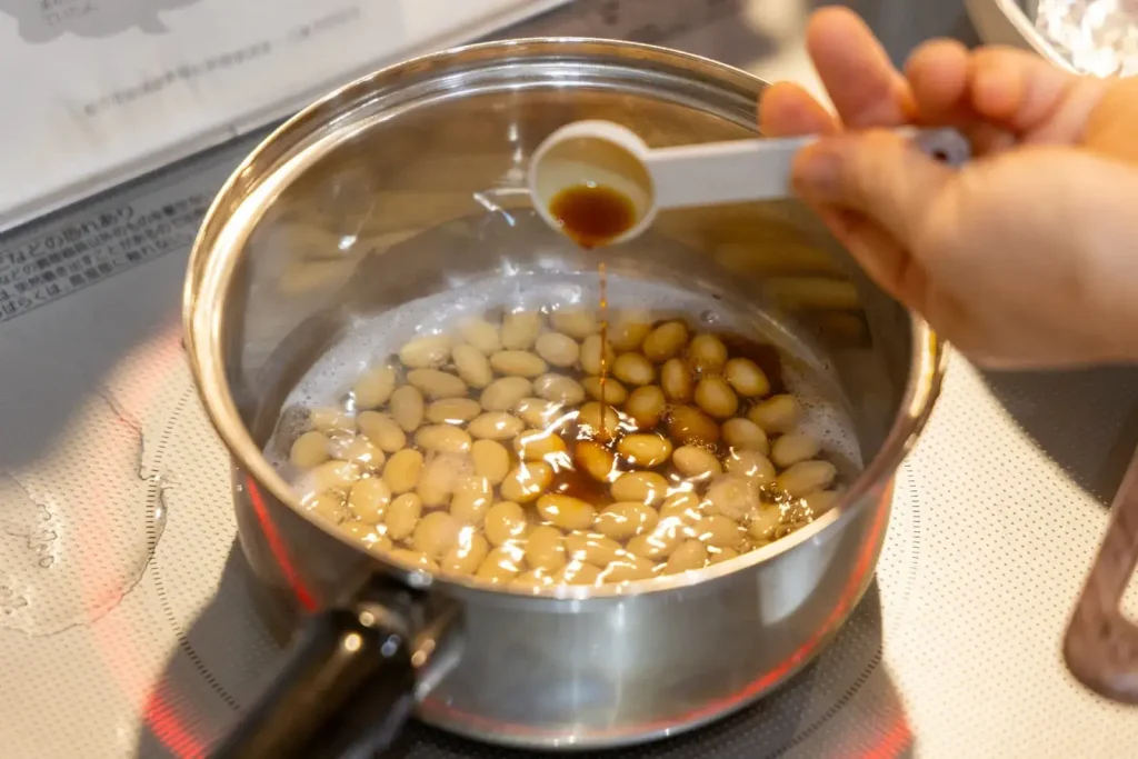 砂糖、濃口しょうゆを加え、大豆に味がつくまで煮ます。