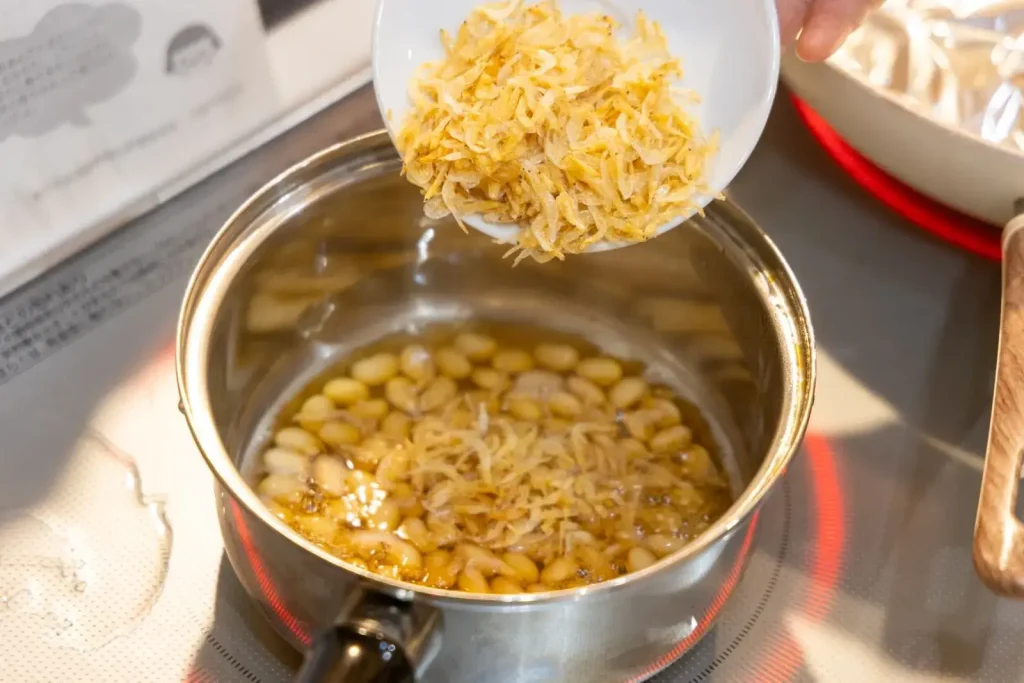 桜えびを加えて、ひと煮たちさせます。