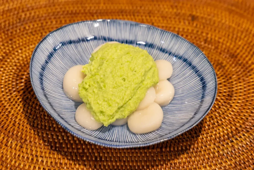 ゆでた白玉を枝豆あんでくるむように和えます。