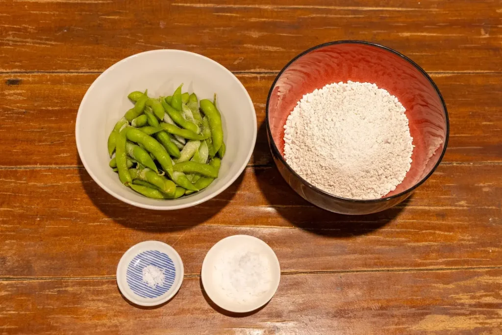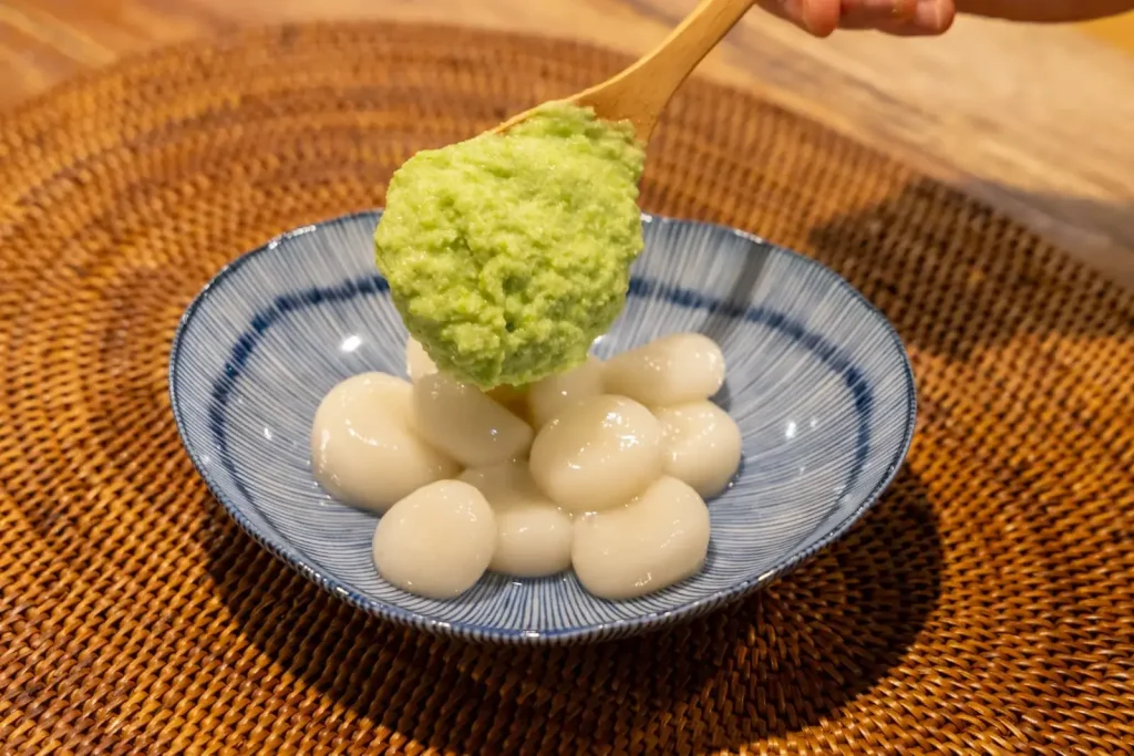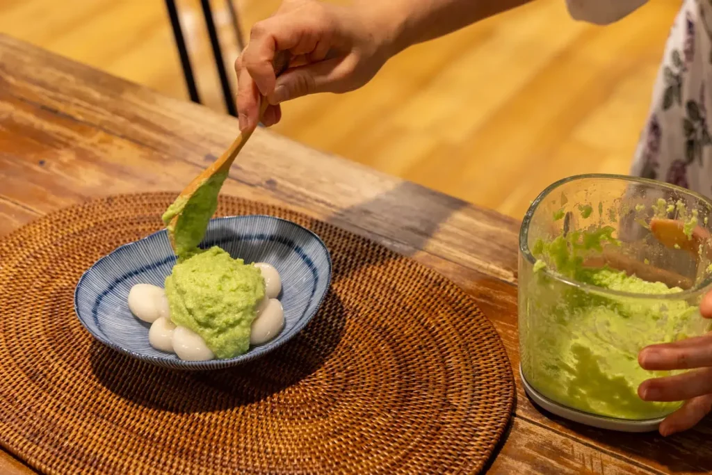 枝豆をすりつぶして砂糖を加えた鮮やかな緑のあんを、やわらかいお団子にからめます。子どもと一緒に作るのにぴったりのメニューでもあります。