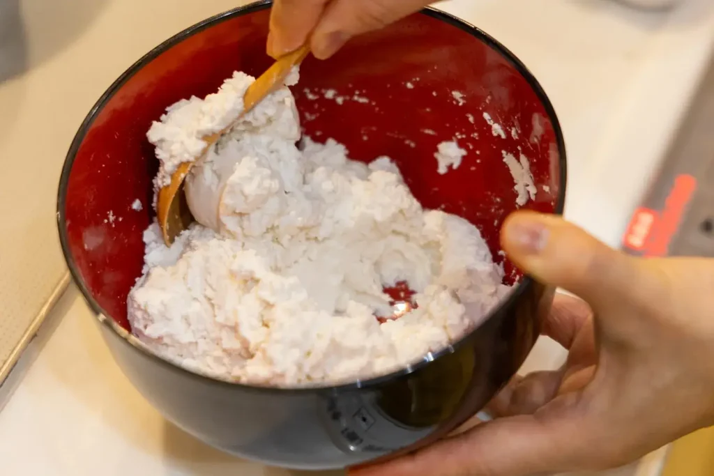 白玉粉に少量ずつ水(分量外)を加え、耳たぶくらいのやわらかさになるまで混ぜます。