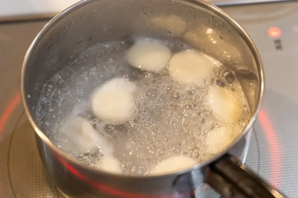 一口サイズに丸めたら、沸騰したお湯に入れ、浮き上がって1分ほどゆでた後、冷水にとります。