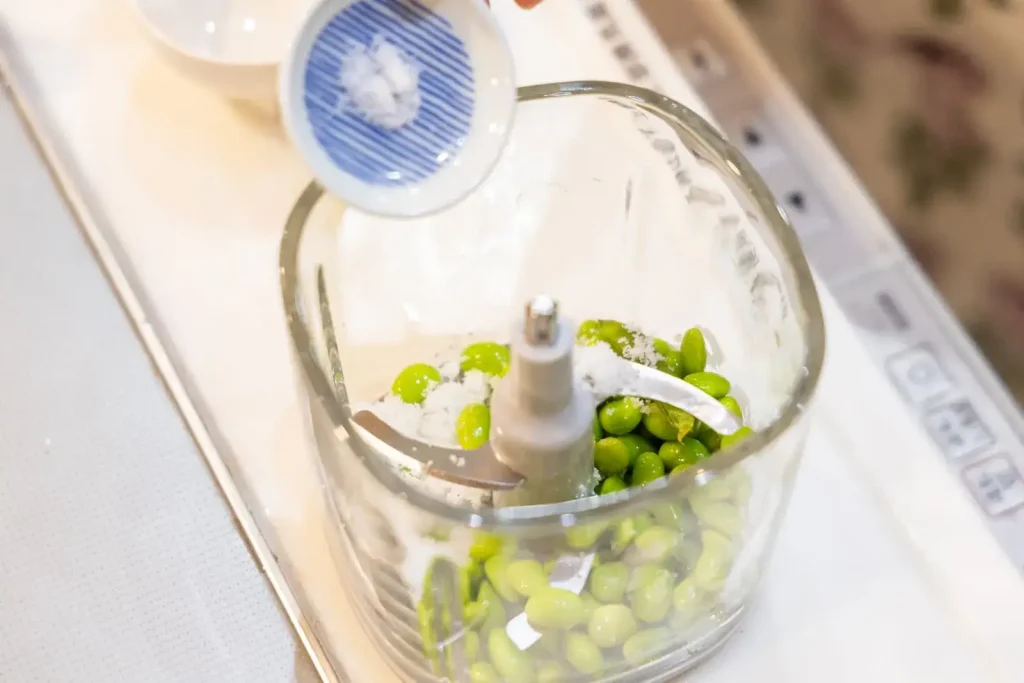 ミキサーやすり鉢に枝豆、砂糖、塩、水を加え、なめらかになるまでつぶします。