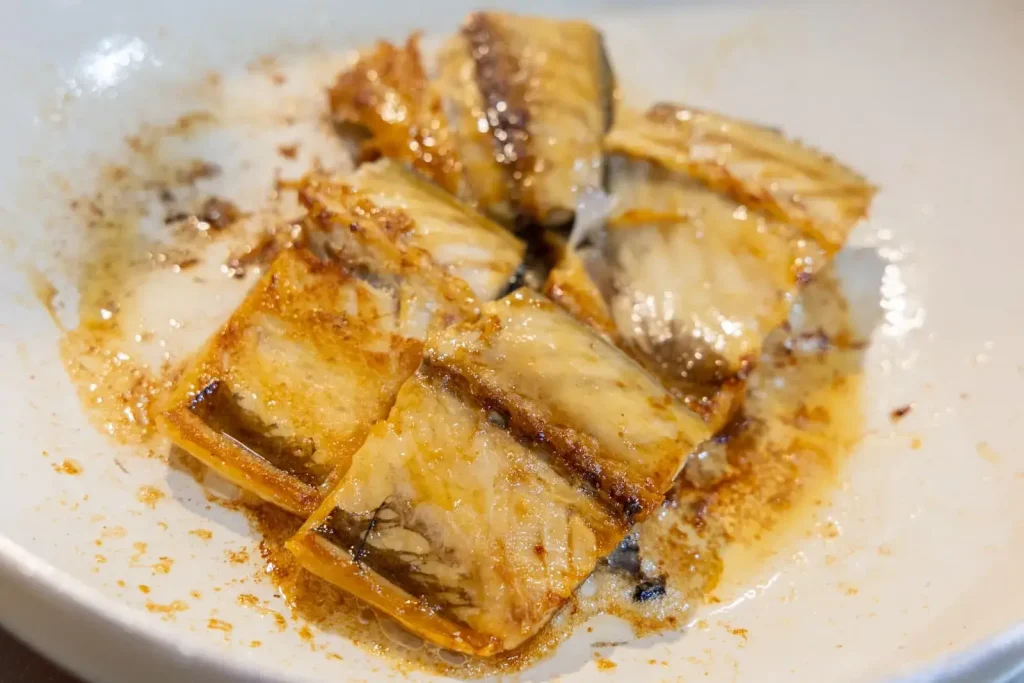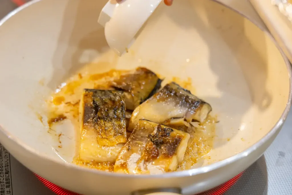 焼き上がったさばにタレを加え、全体にからめます。